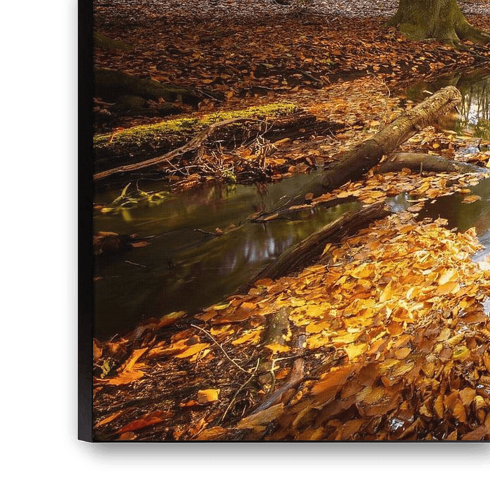 Autumn landscape with colorful forest. 'Indian summer' landscape with colorful orange, yellow and red fall foliage with beautiful beech trees and a crystal clear running water creek. Star shaped sun shining through the dense foliage of an autumn forest, illuminating the water surface of the stream and forest floor.