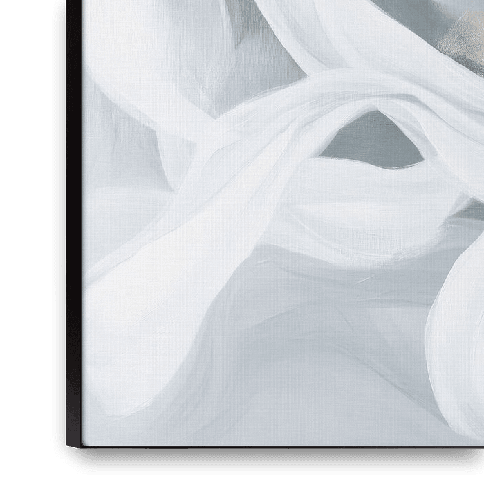 A dance of softly flowing shapes unfolds in gentle shades of grey. The delicate, almost ethereal lines in white and gold seem to float as if carried by an invisible wind. This harmonious composition conveys a feeling of lightness and elegance that transports the viewer into a world of tranquillity and contemplation.