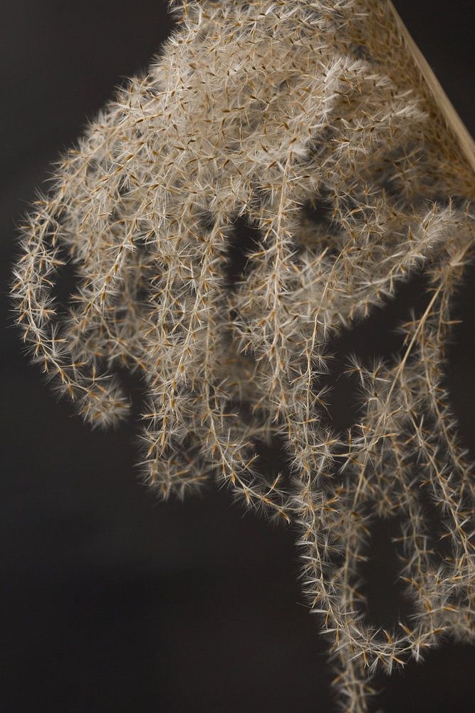 Close-up photo of fluffy ornamental grass plume contrasting against an anthracite wall. There is nice light from a window. This fluffy ornamental reed species is called Miscanthus Sinensis 'Silberfeder' or also Chinese reed or beauty reed. Ornamental grass plumes and dried flowers are widely used as decoration in interiors; but also as wall decoration beautiful! It is a soothing image. This photo goes well with a sober, cool, natural and rural interior. Extra nice to combine this photo with my other dark still life photos!