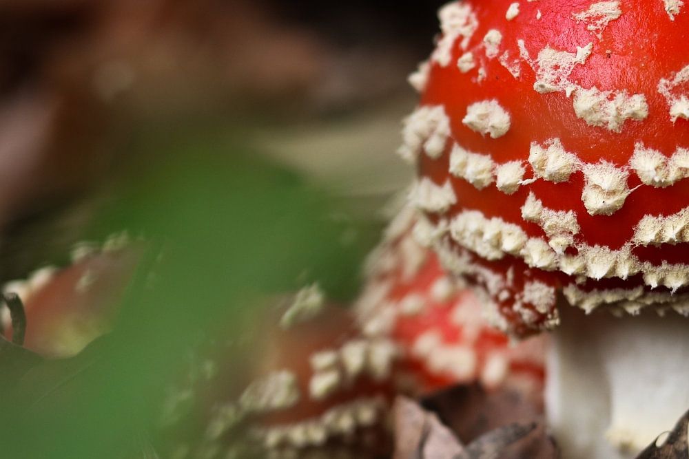 Close-up of autumnal scene of round fly agaric among leaves in the forest, with a green leaf in the foreground.