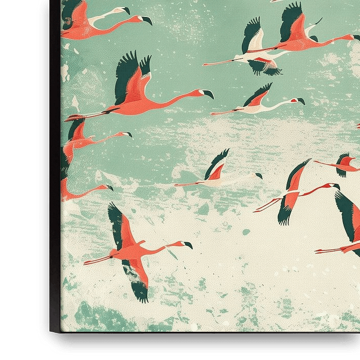 This retro work shows a flock of flamingos floating together through the air, light and seemingly effortless. The composition feels playful and dynamic: the birds are captured in different poses, making movement and rhythm central. The whole thing exudes freedom, as if the flamingos do not care about direction or destination and are…