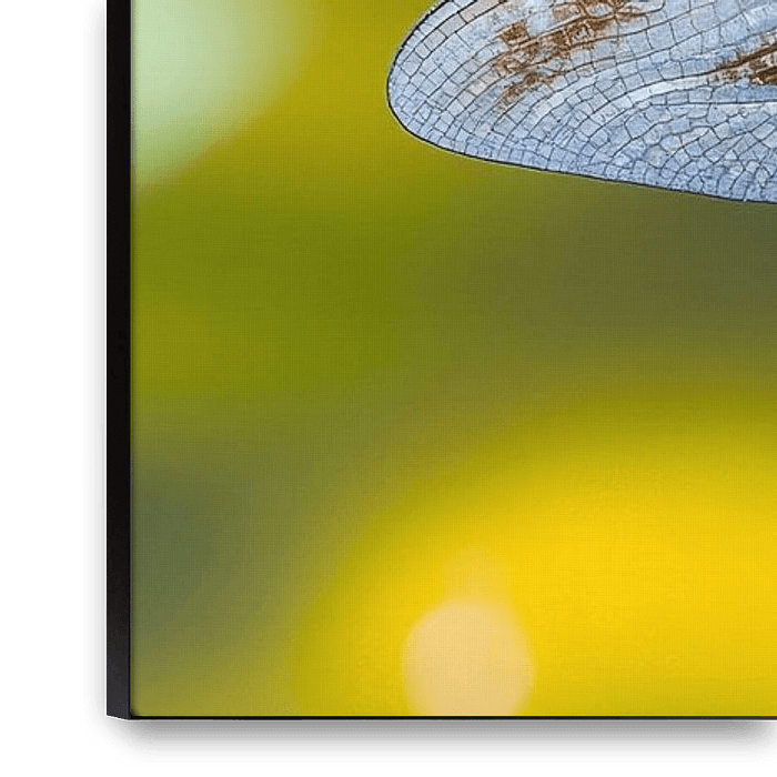 A fascinating creature hovers majestically above a leaf, its delicate, iridescent wings catching the light in an impressive way. The harmonious colours and fine details create a calming atmosphere. Ideal as an eye-catcher in the living room or in a creative workspace, it brings nature and elegance to any environment.