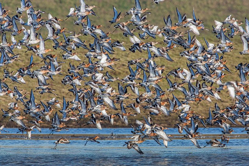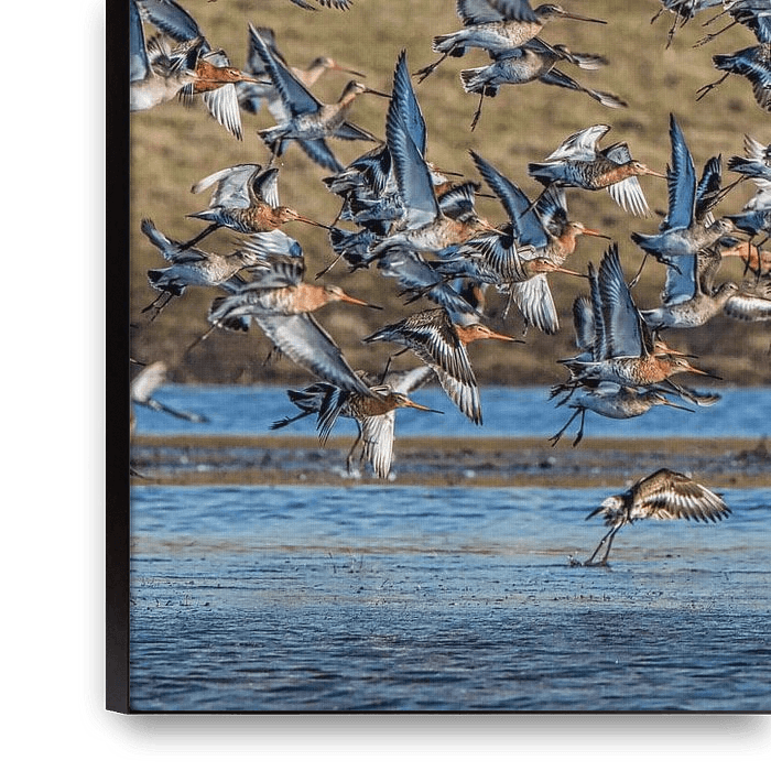 Buy this bird art Flying godwits. by Frans Lemmens on canvas, ArtFrame, poster and wallpaper, printed on demand in high quality.