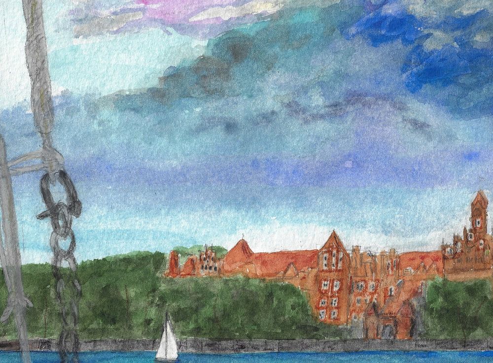 This watercolour shows the view of the harbour of Flensburg from a ship, at the shore you can see the naval school Mürwik.