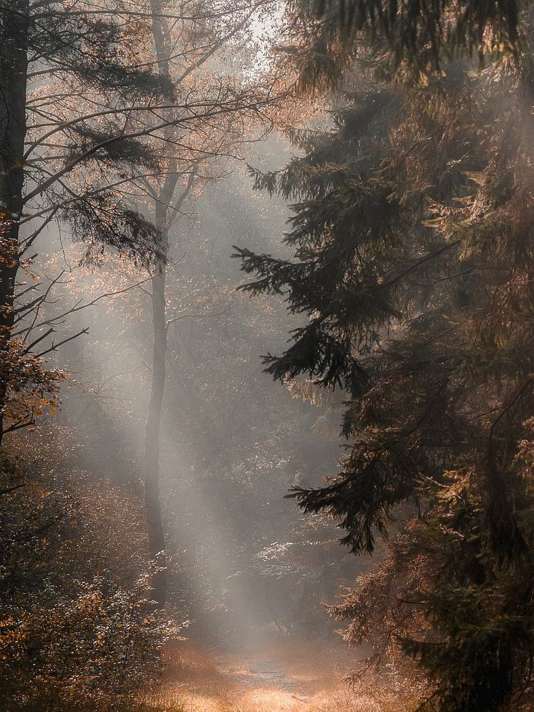 Buy this landscape artwork Fog and sunshine in an autumn forest by Daniël de Jong on canvas, ArtFrame, poster and wallpaper, printed on demand in high quality.