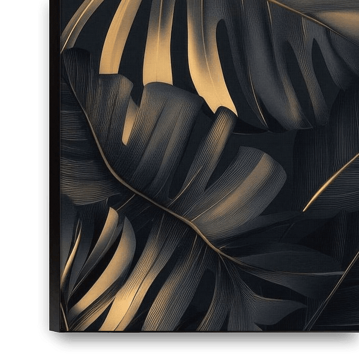 A luxurious interplay of dark, vibrant green tones and shimmering gold unfolds as if the leaves were shimmering in a mysterious jungle. This elegant composition lends the room an exotic atmosphere, while the curved shapes of the palm leaves dance harmoniously together and transport the viewer into a world of tropical dreams.