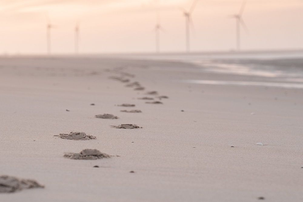 Footsteps on the beach near Haamstede in Zeeland. In the background, you can see the Western Scheldt storm surge barrier during sunrise.