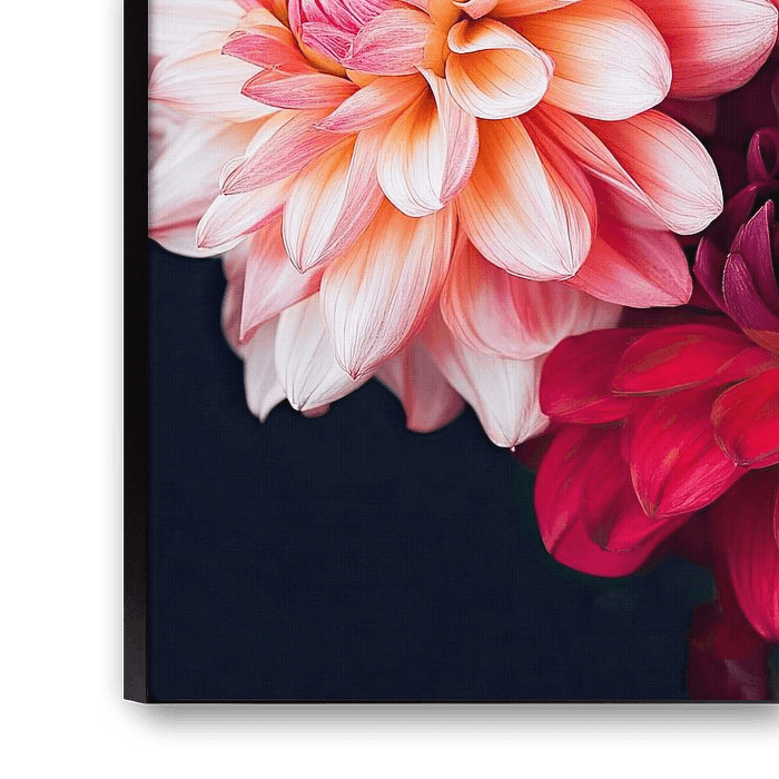 A botanical print of colourful dahlias'against a dark background.