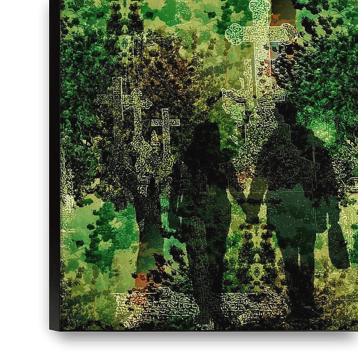Photo-graphics built from multiple layers -- each layer itself also created through digital editing and repetition. Thus, trees, tombstones and crosses, human figures and a pheasant merge into a freshly-colored, surrealistic whole.