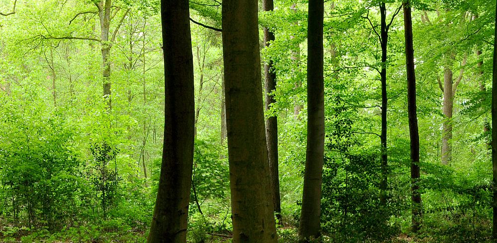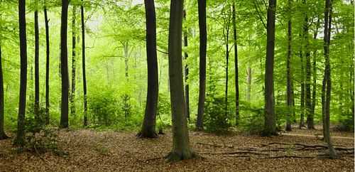 A photograph of a forest with beech trees. The new leaves give the landscape a fresh, green look.
