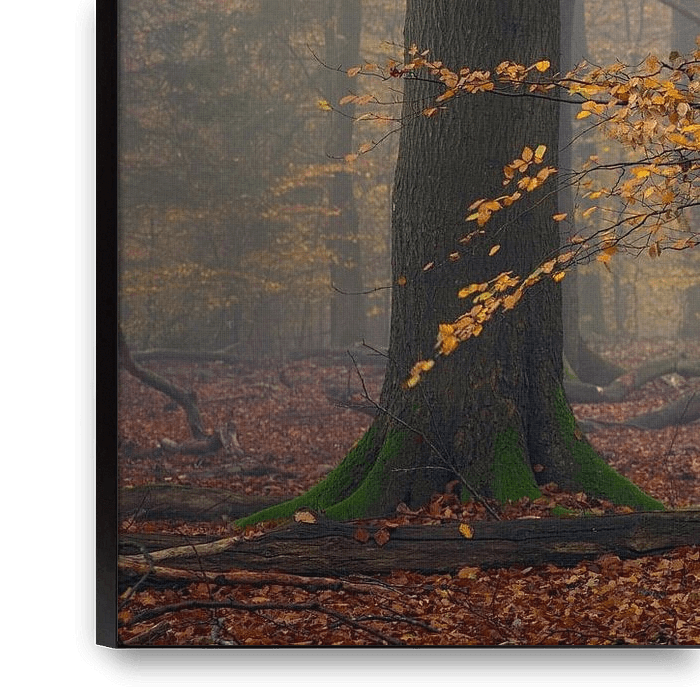 An atmospheric misty morning in October, the tenderness of the orange-yellow beech leaves stand out so beautifully against the dark trunks
