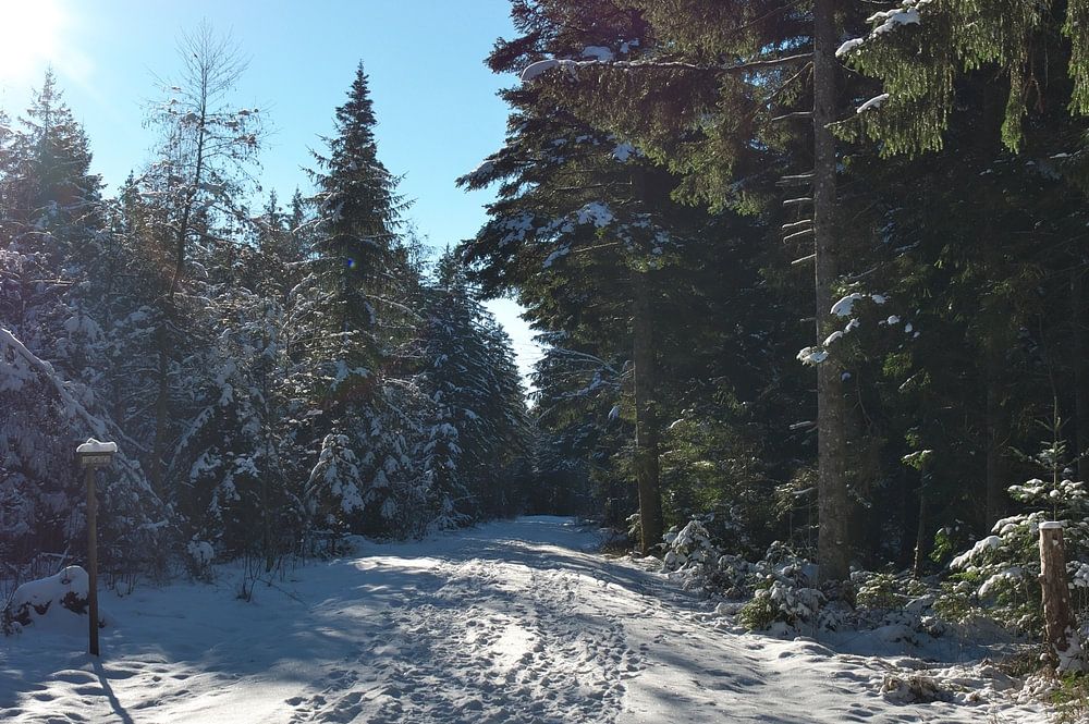 Winter landscape in the forest, with lens flare, snow and a trail.