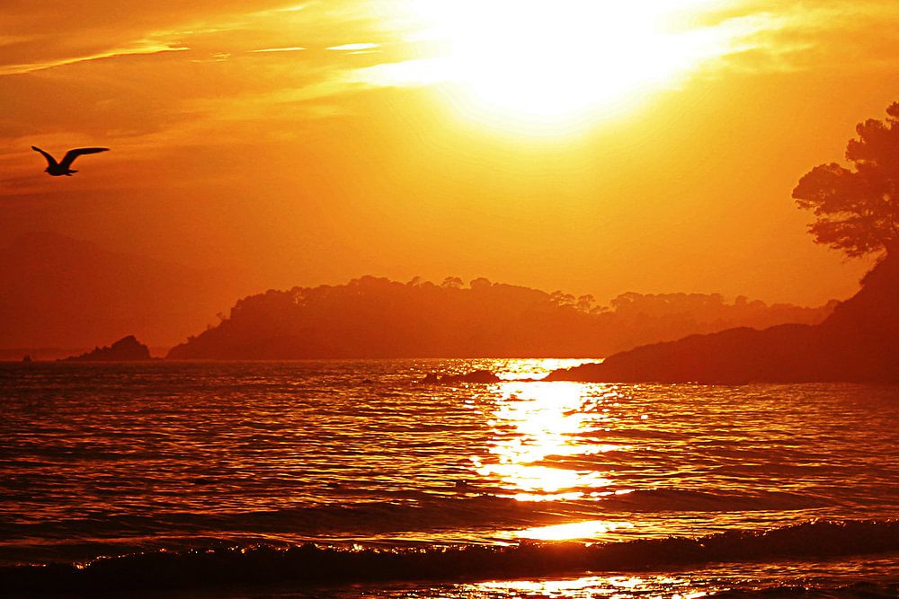 A beautiful sunset and a seagull flying by at Fort de Bregancon in France.
