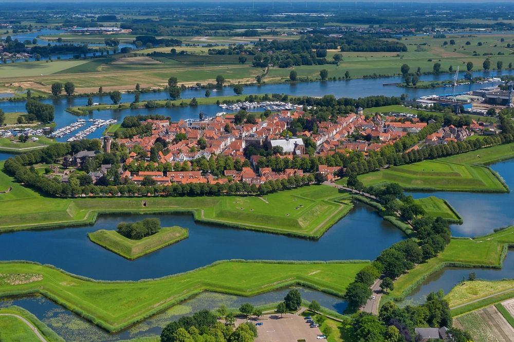 The old fortified town of Heusden seen from the air. You can clearly see the city wall surrounding the centrally located village. The beautiful dutch sky above makes it complete.