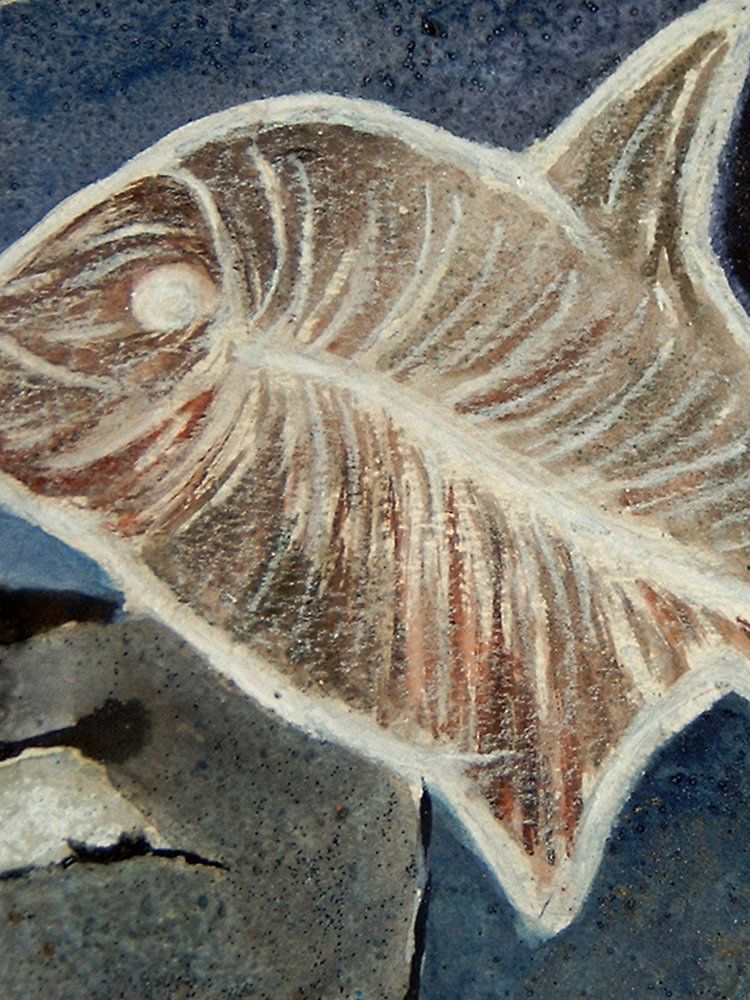 Kugelfisch, Fossilien aus dem Solnhofener Plattenkalk.Meeresbewohner, Abdruck,aus alter Zeit, Gestein, blau,