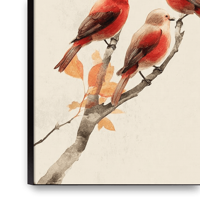 This artwork depicts four red-toned birds sitting together on a tree branch, surrounded by warm autumn leaves in shades of orange and red. The background consists of a soft beige colour with a watercolour-like texture, making the birds and leaves stand out even more clearly. The elegant shapes, subtle brushstrokes and natural…