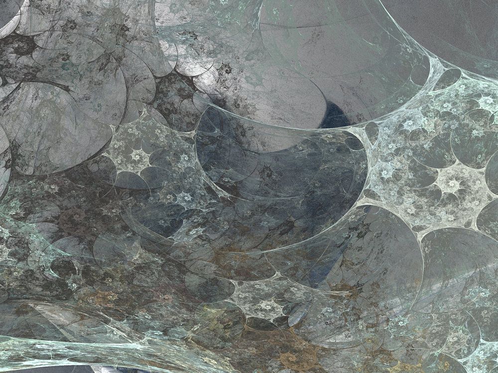 Mysterious fairy web in grey blue, ice blue and earth tones. Curly like a snail shell, with flowery figures.