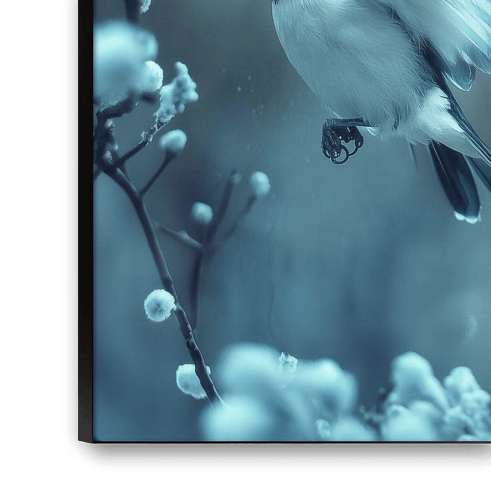 This enchanting image shows a delicate bird with deep blue feathers gliding gracefully through a winter landscape. The soft pastel tones and shimmering light create a serene and dreamy atmosphere, while the detailed wing beats highlight the movement of flight. A perfect artwork for those who love nature, elegance and the magic of a frozen moment.