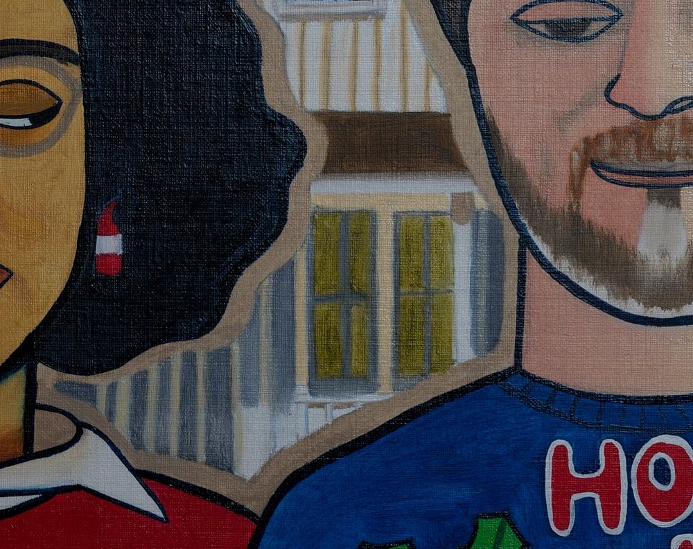 This is a pop art and more cheerful version of Grant Wood's American Gothic painting. It depicts two people in Christmas sweaters outside a house. It is part of a series of oil paintings where I revisit classic paintings. The question I ask myself in front of each classic is, if Grant Wood was a pop art painter, how would he have painted this? This painting would suit people who are classic or traditional in appearance but with a twist.
