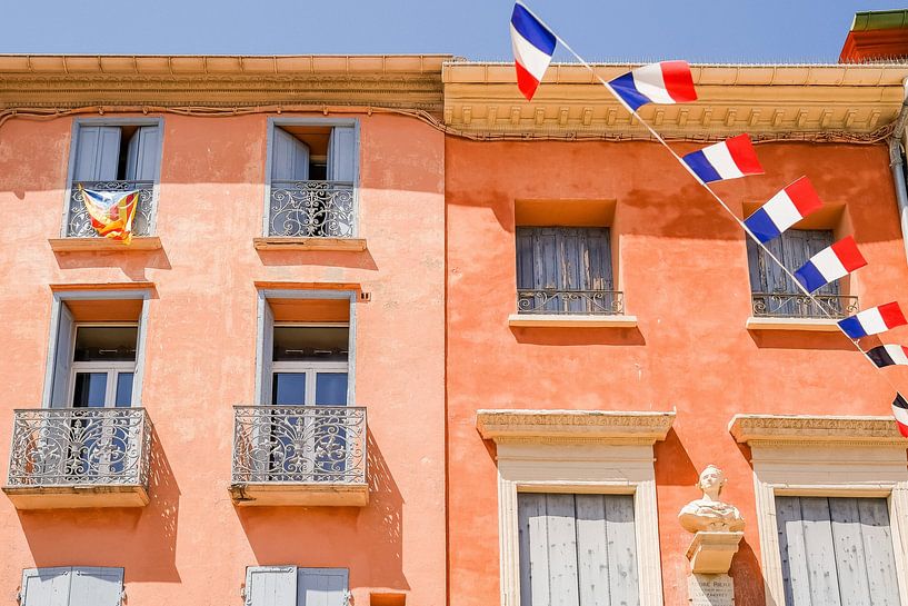 Buy the photo French façade with flags by Jasmijn Brussé on canvas, ArtFrame, poster and wallpaper, printed on demand in high quality.