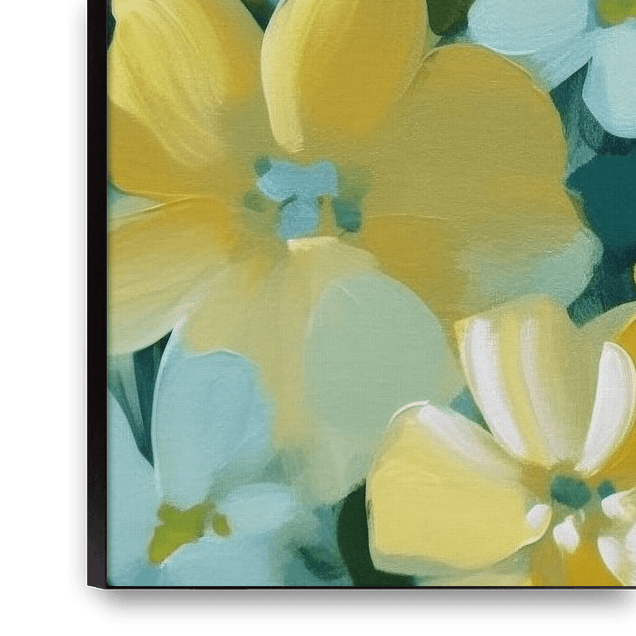 In this stunning modern abstract painting, a sprawling meadow comes to life with an explosion of colour and energy. The artist's skillful brushwork and bold use of colour draw the viewer's eye to a vibrant tapestry of hand-painted flowers. Bright yellow, calming turquoise and lush green blend into a harmonious yet vibrant symphony of…