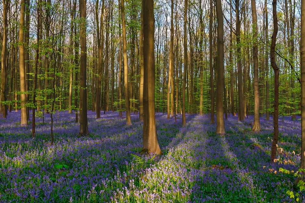 In spring, the wild hyacinths come into bloom in the Hallerbos, together with the budding of the fresh green leaves of the beech trees and a rising morning sun, there is a serene atmosphere in the forest. The light catches beautifully between the trees on the purple coloured wild hyacinth.