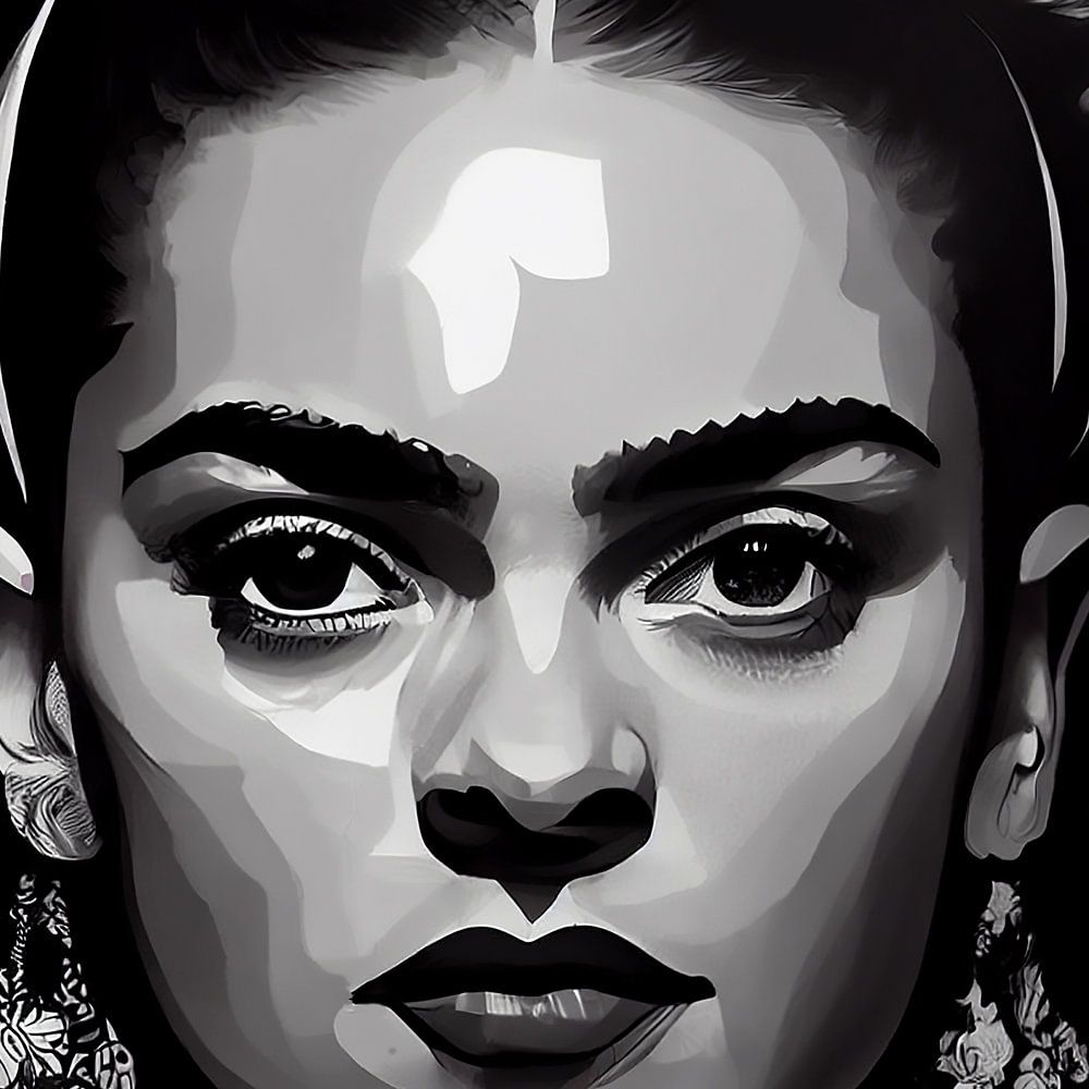 Beautiful black and white image of Frida with flowers in her hair. Pop art full of emotion and imagination. Fits various trends and styles. A true artist.