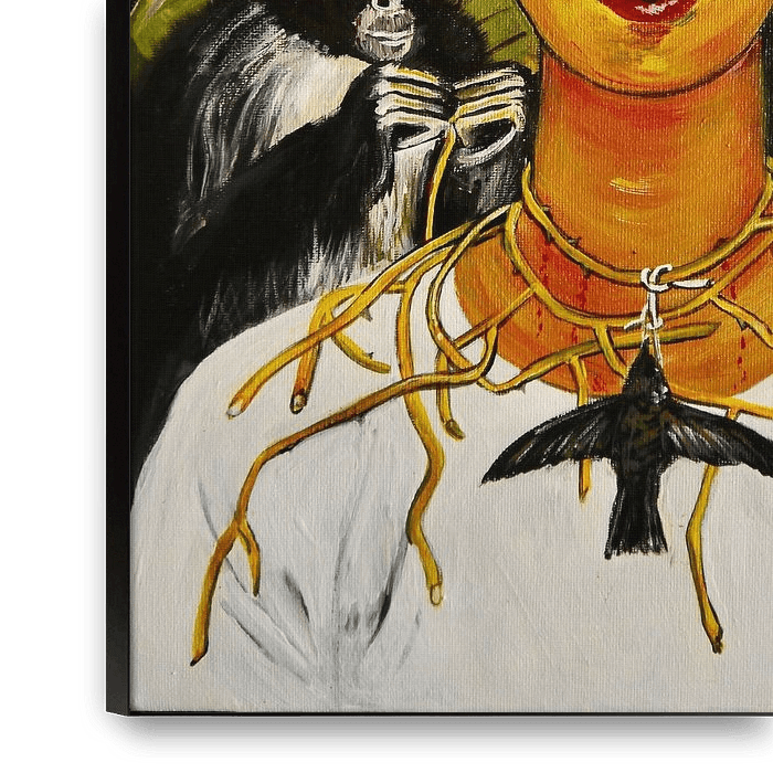 This painting shows Frida, the Mexican artist who achieved fame. A sad fate moved her to paint, and so she created numerous self-portraits.