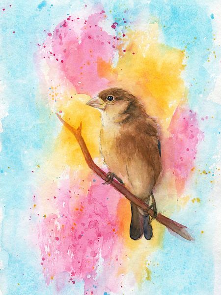 A delicate watercolour painting depicts a female sparrow sitting gracefully on a branch and looking cheerfully to the left. The background is abstract in design with bright splashes of colour in pink, orange…