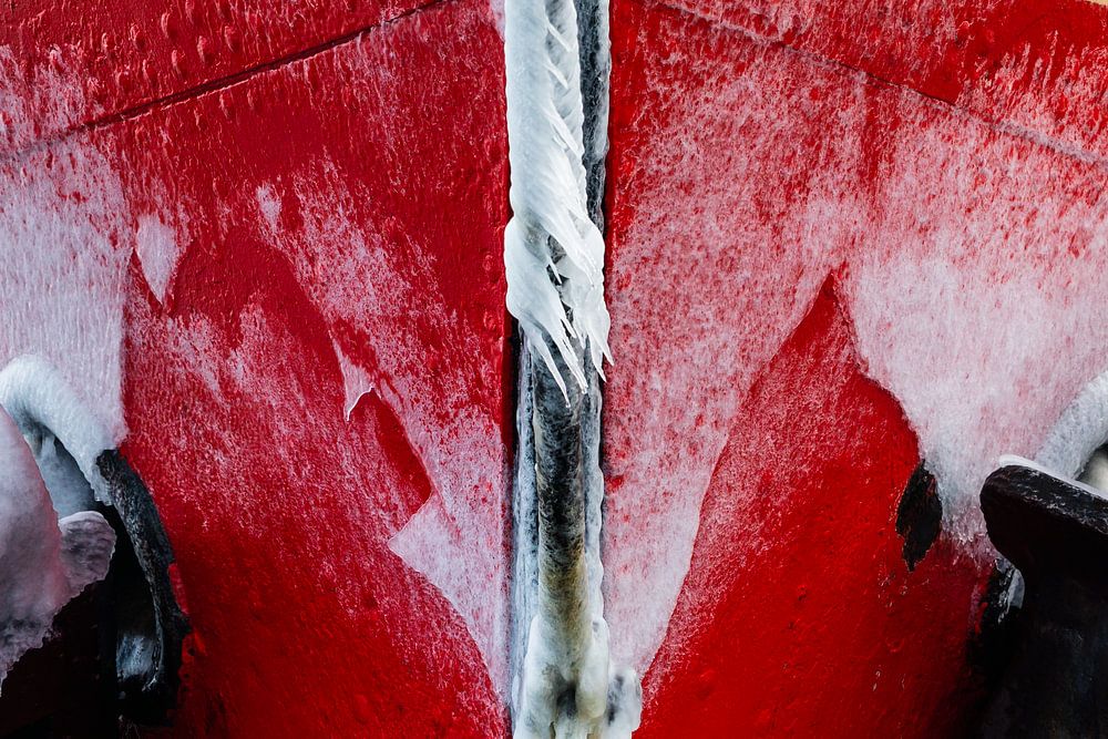 Frozen bow and anchors on S/V Noorderlicht. The Noorderlicht is a 1910 two-masted ship in the striking colors of red and yellow. The ship is used as an expedition sailing vessel in Spitsbergen (Svalbard) and Norway.