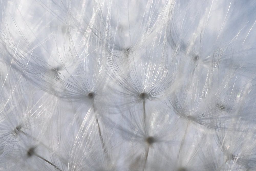 Close-up of the fruit of a dandelion with glistening silvery fluff against a blue sky
