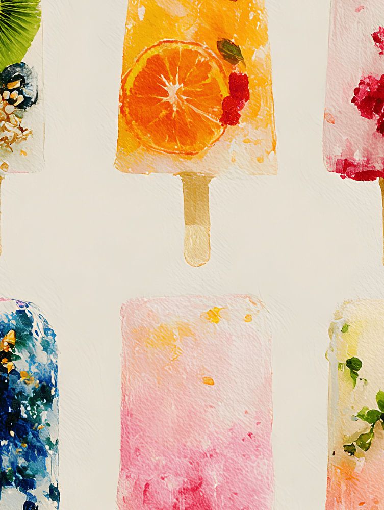 In this artwork, fruity ice creams are brought to life in a mix of summer colours and shades, which blend beautifully and evoke the summer atmosphere.