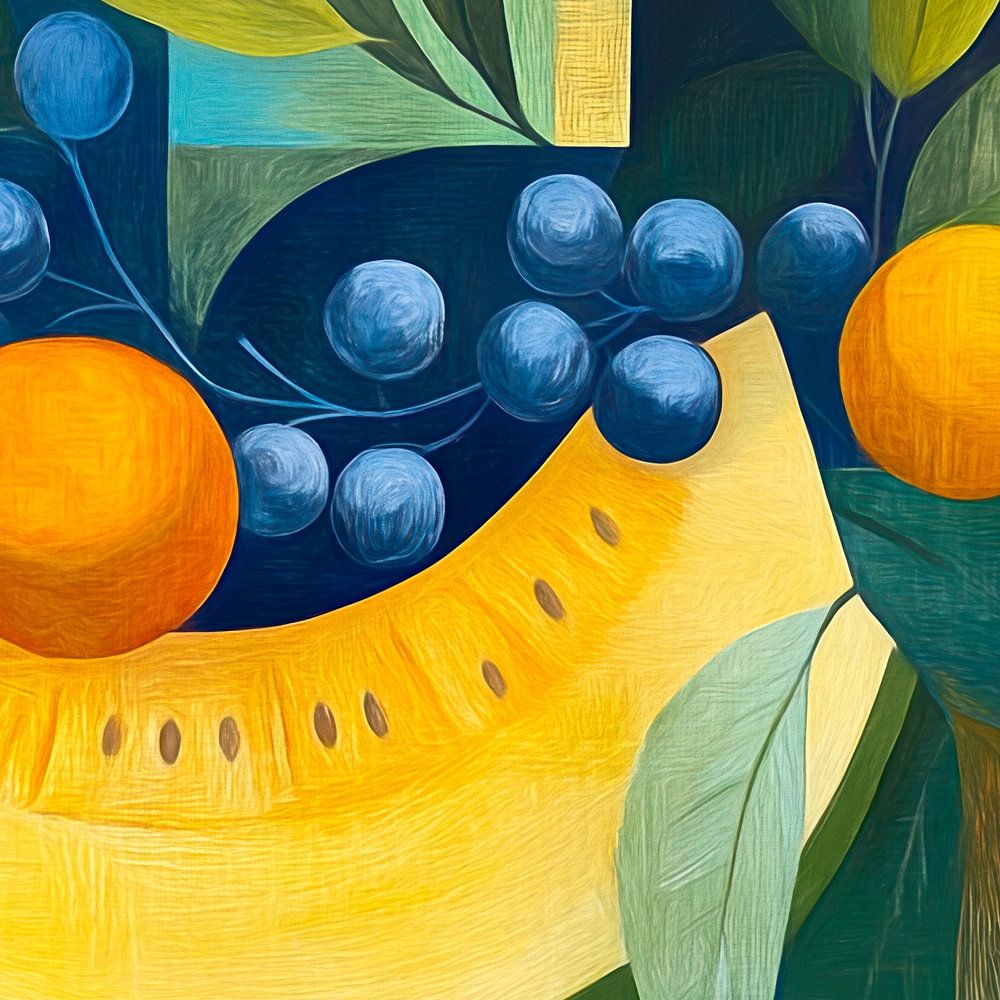 A lively composition with abstract geometric shapes and a focus on fruit elements such as sliced melons, berries and oranges. The background consists of intersecting blocks of colour that lend depth and contrast to the still life elements.