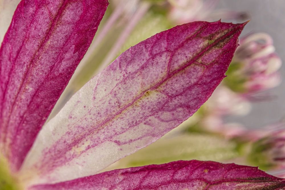 "Fuchsia-coloured Zeeland Knot with bokeh in the background" is a macro photo of a piece of a Zeeland Knot (Astrantia Major). This beautiful little flower was photographed obliquely from behind, so you can see the fuchsia leaves beautifully. From the three fuchsia-coloured petals, where the focus is, everything in front and behind slowly fades away. This gives a sense of depth to the work and at the same time creates a dreamy atmosphere with it.