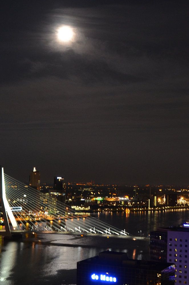 Rotterdam photographed in the evening from theRed Apple(127M) with views on de Rotterdam(151M), Erasmusbrug(139M), Montevideo(140M), and the World Port Center(123M). Lit up by the full Moon with a beautiful refcetion in the Maas river and as background a dark sky and the city lights.