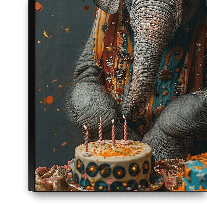 An elephant in a festive mood with a birthday hat and cake celebrated with confetti in the background.