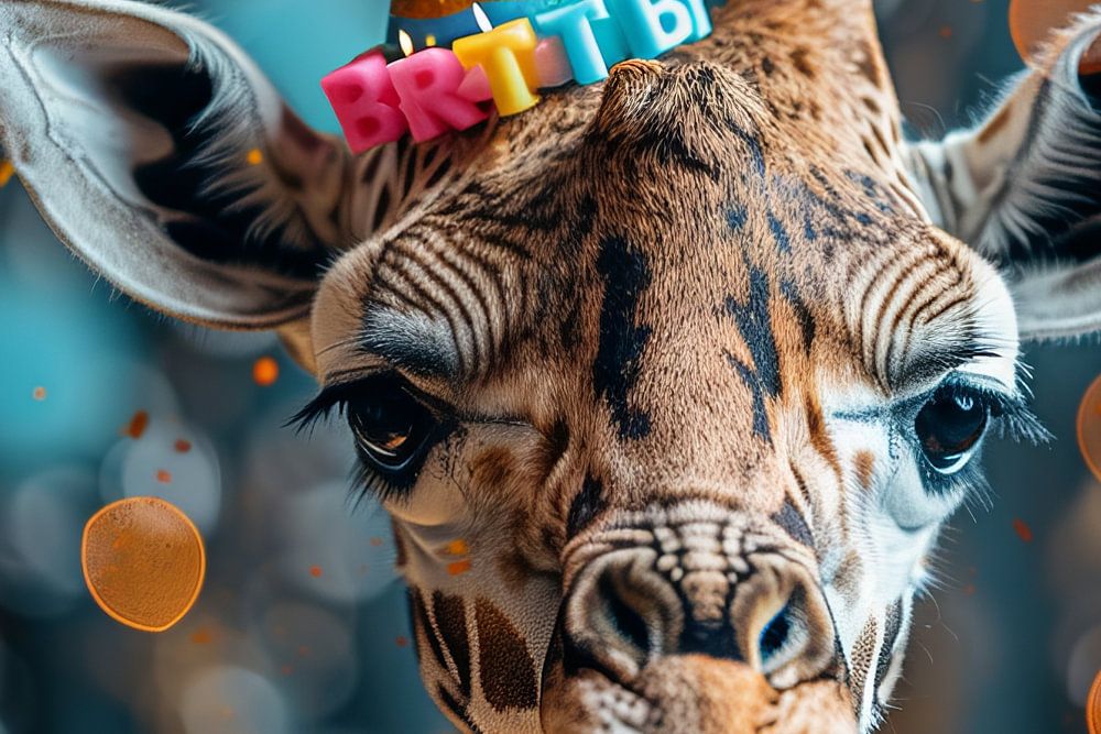 A surprising portrait of a giraffe celebrating her birthday in a 60s 70s disco outfit with fluffy party hats and round glasses.
