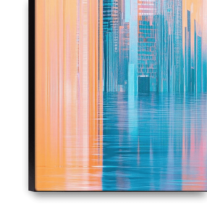 A soft colour dream of pastel nuances combines futuristic silhouettes with flowing lines. The harmonious blend of vibrant blue and orange tones conveys a sense of movement and energy. This work of art adds an exciting touch to any modern living room and invites you to dream while exuding a touch of urban elegance.