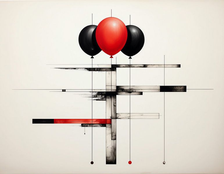 'où s'élèvent 3 ballons rouges et noirs. La symbolique étant de toujours essayer de s'affranchir des limites dans un mouvement vers le haut sans oublier son ancrage sur la terre. Ce subtil équilibre des forces devrait permettre de traverser des caps assombris par la matière. Ensemble graphique en rouge et noir pouvant…