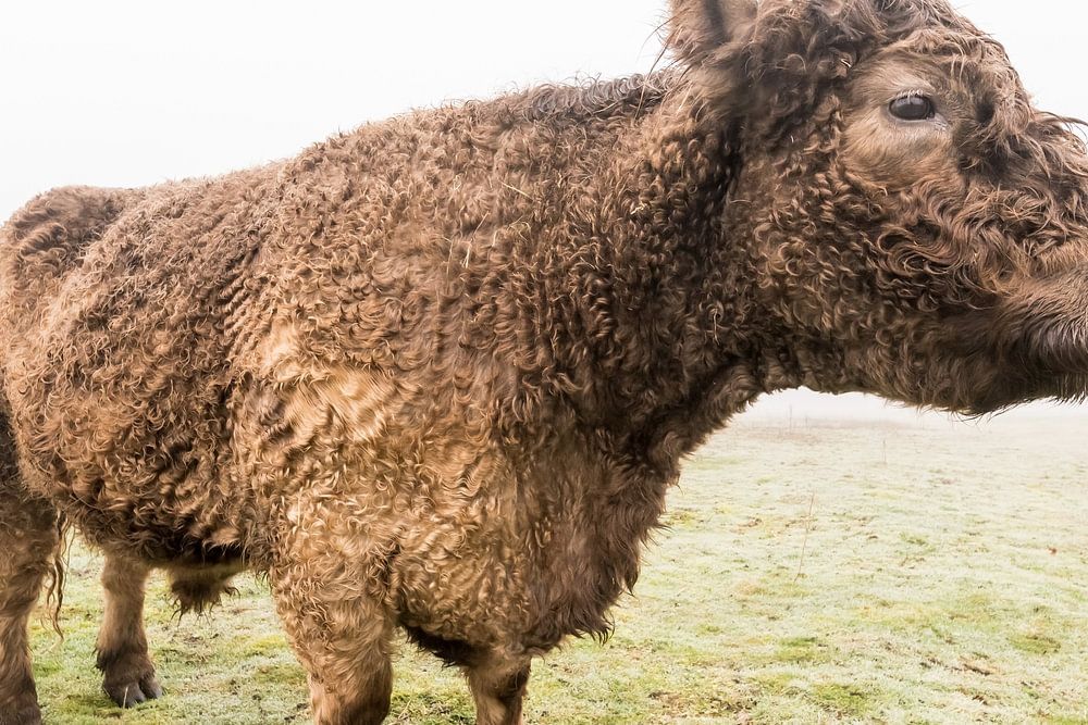 On a foggy morning in the meadow, these cute Gallowys are grazing