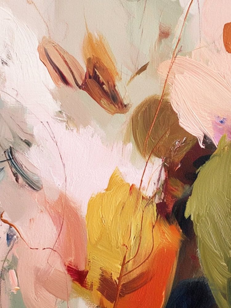 A vibrant abstract composition inspired by floral forms, combining soft and bold tones. Expressive brushstrokes and layered textures create movement, contrast, and a sense of organic energy.