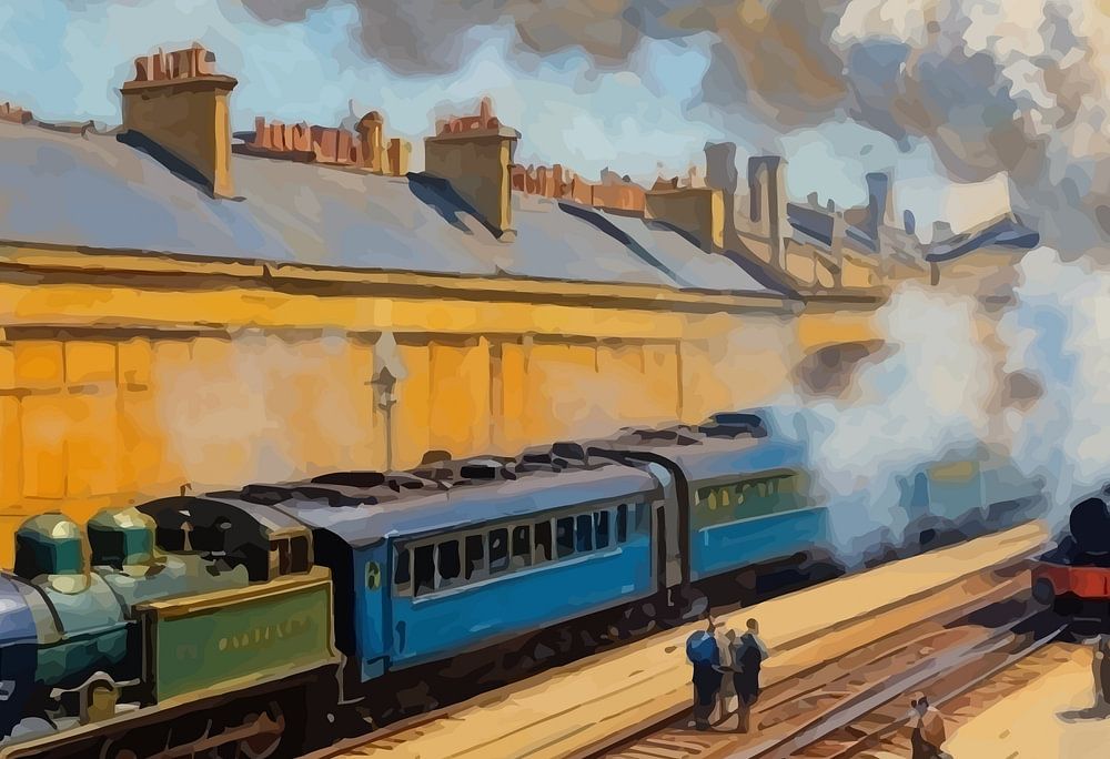 Billowing clouds of steam rise against the steel arches of Gare Saint-Lazare in this dynamic impressionist scene. The artist’s brush captures the shimmer of sunlight on iron and glass, blurring figures hurrying across the platforms. Hues of silver, blue, and soft beige create an atmosphere both bustling and poetic—an ode to travel, movement, and the timeless rhythm of Parisian life.