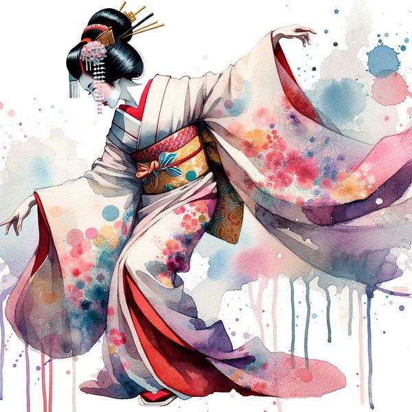 A geisha dancer is captured in side view, leaning into a graceful step as her kimono expands like a wide ribbon across the composition. The long sleeves sweep through open space, filled with soft floral bursts, layered washes, and gentle splashes that create a sense of rhythm. Look closer and you will notice fine textile patterns,…