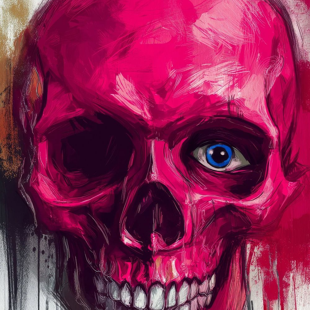 This bold illustration centres on the human skull, infused with bright colours and abstract elements that capture the impermanence of life in an intense visual style. Rendered in vibrant magenta, the skull exudes unprecedented power through its emphasis on the detailed textures of the bone structures, while its contrast with the abstract drops of dark grey and gold evoke a sense of decay. What makes this work extra fascinating is the eye that features prominently - bright blue and unmistakably alive, which has a deeper meaning within the theme of life versus death. This idea of contradiction is reinforced by the bold colours that meander through the composition, representing both chaos and beauty. The work balances between the abstract energy of the colours and the starkness of the skull, conveying an impactful message of impermanence and the power of memory. The modern, grungy style makes the piece both tough and introspective, perfect for the lover of expressive art who wants to explore the mystery of existence at the same time.