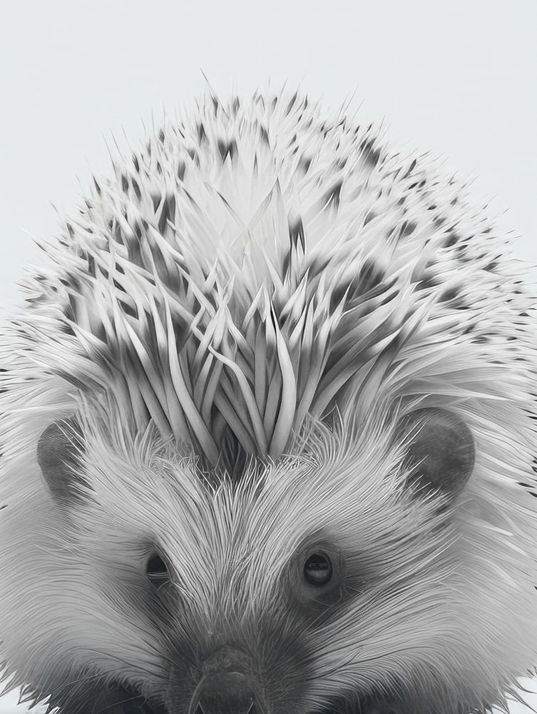 "Gentle Curiosity" is a touching image of a hedgehog, whose delicate spines and piercing eyes exude an air of wonder and thoughtfulness. The monochrome tones emphasise the texture of the spines and the soft facial features, while the reflection on the background adds an extra dimension of depth. This portrait exudes a tender intimacy, making it a lovely addition to any space that desires a sense of calm and wonder. It is an excellent choice for those who appreciate how the natural world, even in its smallest essence, can be both beautiful and intriguing.