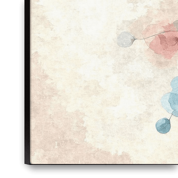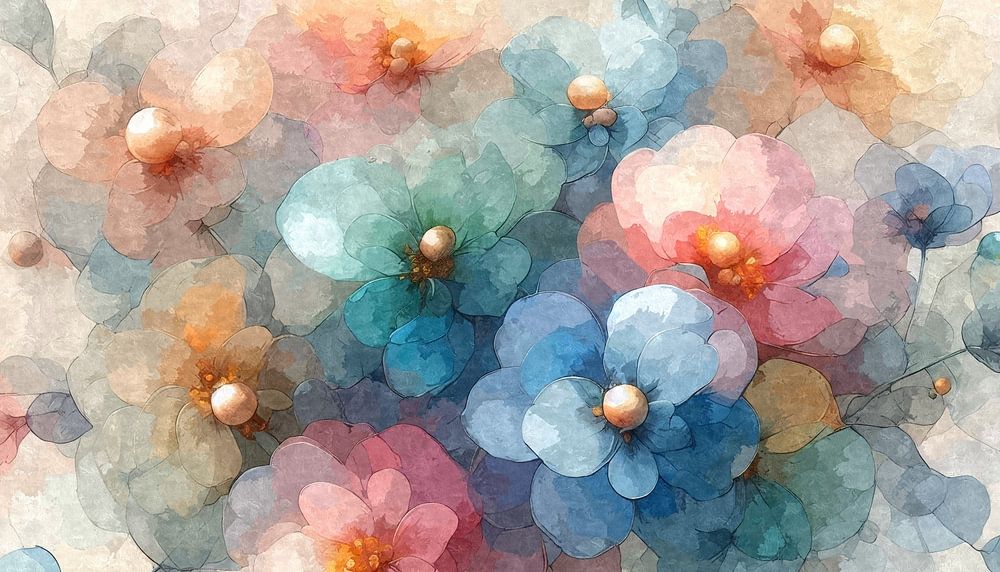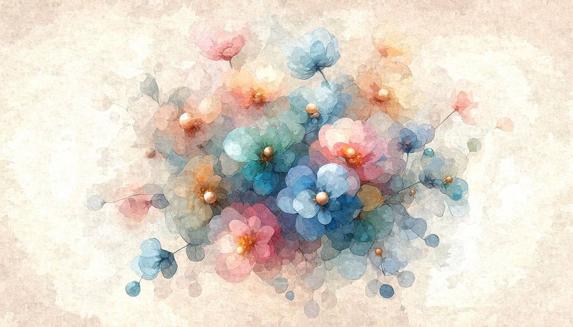 This watercolour motif shows a harmonious floral composition in delicate colours such as pink, blue, yellow and orange. The round, pearl-like flower centres and the soft petals create a calming, almost meditative effect.