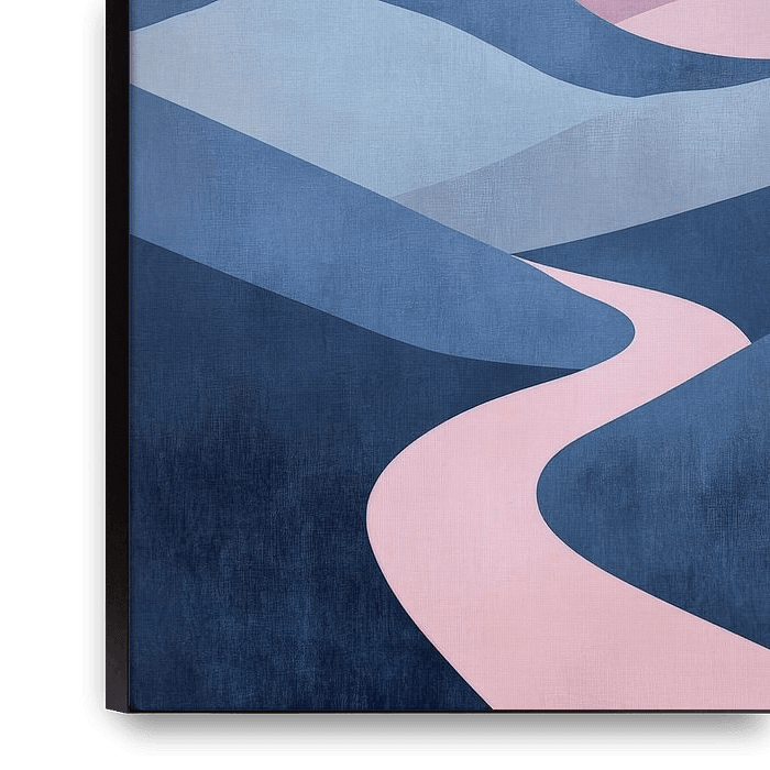 A gentle colour gradient of blue and pink hills framed by bright yellow sunlight creates an atmosphere of peace and harmony. The curved path invites you to dream and relax, ideal for the bedroom or living room, where it creates a calming, inspiring mood.