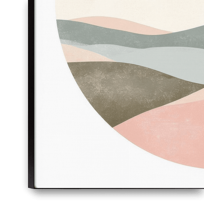 A harmonious composition of rolling hills in soft pastel colours unfolds under a large, calming circle of sunlight. The flowing lines of the landscape radiate a peaceful serenity, while the soft earthy tones evoke the tranquillity of nature. This scene invites you to immerse yourself in a stylised dream world where time seems to stand…