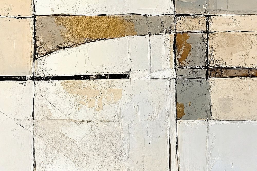 Geometric Abstract | Beige Balance - This abstract painting shows a composition of geometric shapes in predominantly beige and grey tones, with accents of gold and deep black, exuding a sense of tranquillity and minimalism.