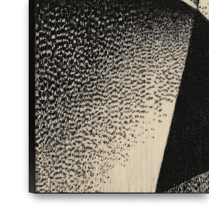 This abstract geometric composition consists of intersecting triangles that form a symmetrical pattern around a common centre point. Graded shades create a gradient effect in which dark areas at the edges transition into lighter tones in the centre. A striking diagonal line divides the surface and emphasises the precise geometry. The…
